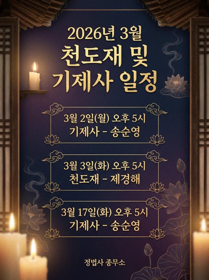 | 2026년 정법사 3월 정법사 일정 안내 | 공지사항[행사] | 23/02/2026 | 337 |